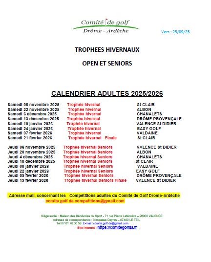 Les inscriptions étant closes, les tableaux des matchs ont été finalisés et sont affichés sur le panneau d’affichage situé sous le porche à l’entrée du golf. Ils sont aussi accessibles par le bouton « Championnat du club 2025 » de cette page. Bons matchs à tous les participants !